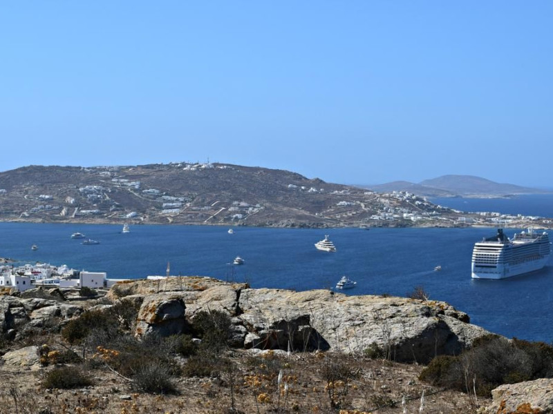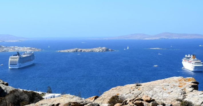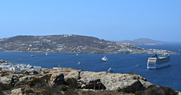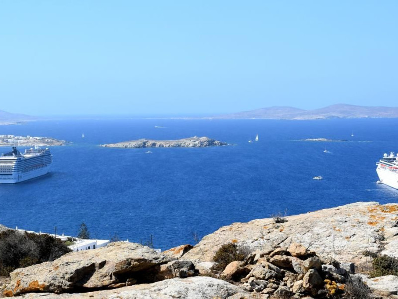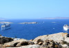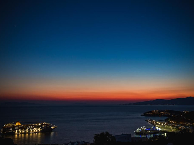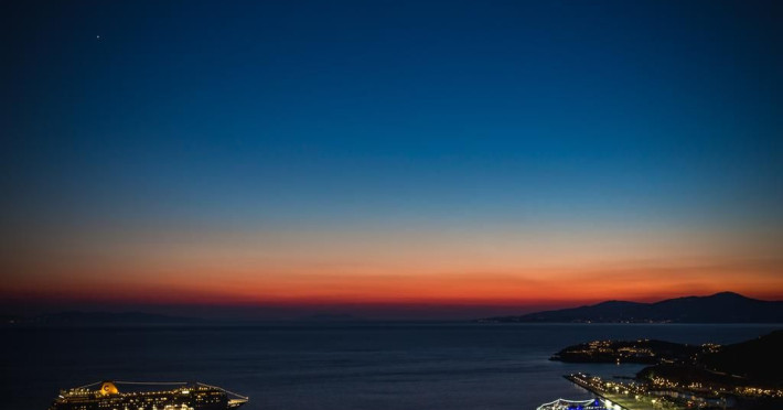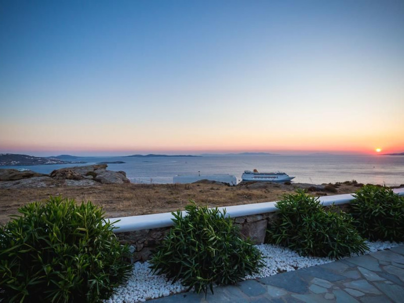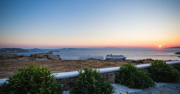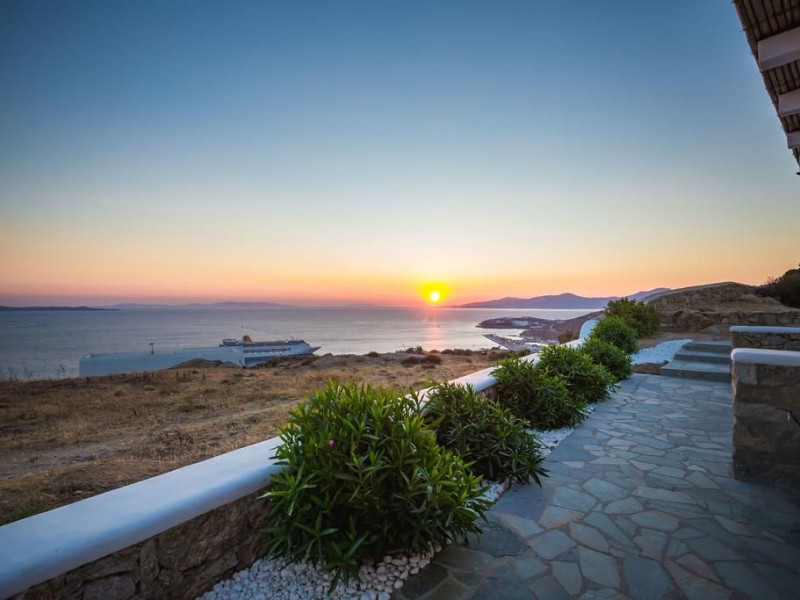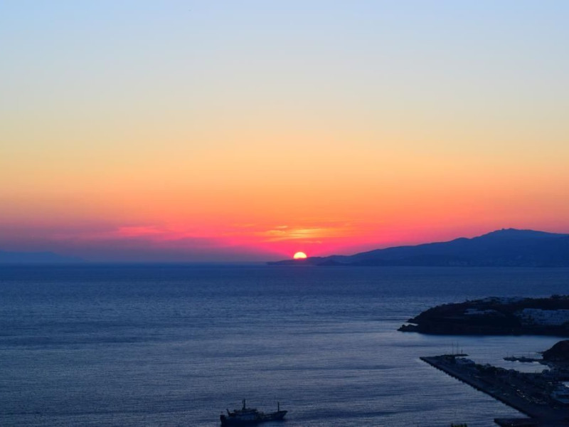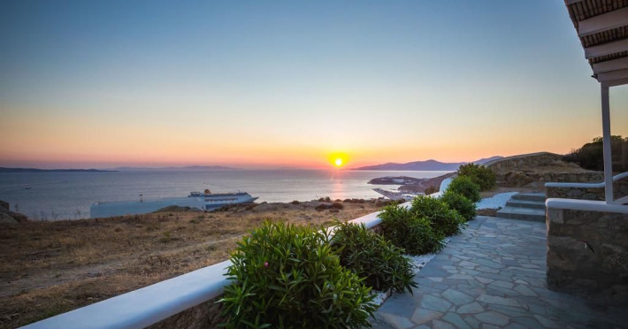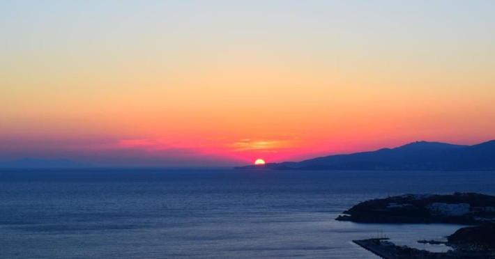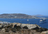 Gaze at a timeless panorama: downtown windmills, Delos Island, Port and neighboring Tinos Island.